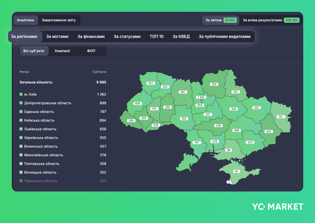 YC.Market показує не лише окремі компанії, а й масштаб галузі — кількість суб’єктів, аналітику за регіонами, містами, фінансами, КВЕДами та видатками.