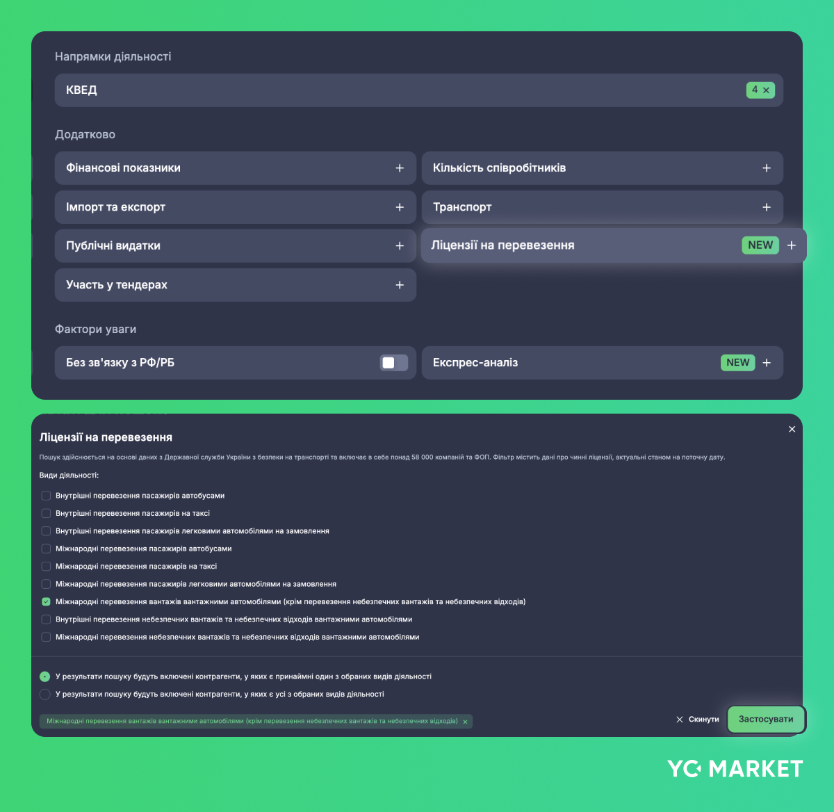 Цей фільтр дозволяє знайти лише компанії, які офіційно мають ліцензію на вантажні або міжнародні перевезення.