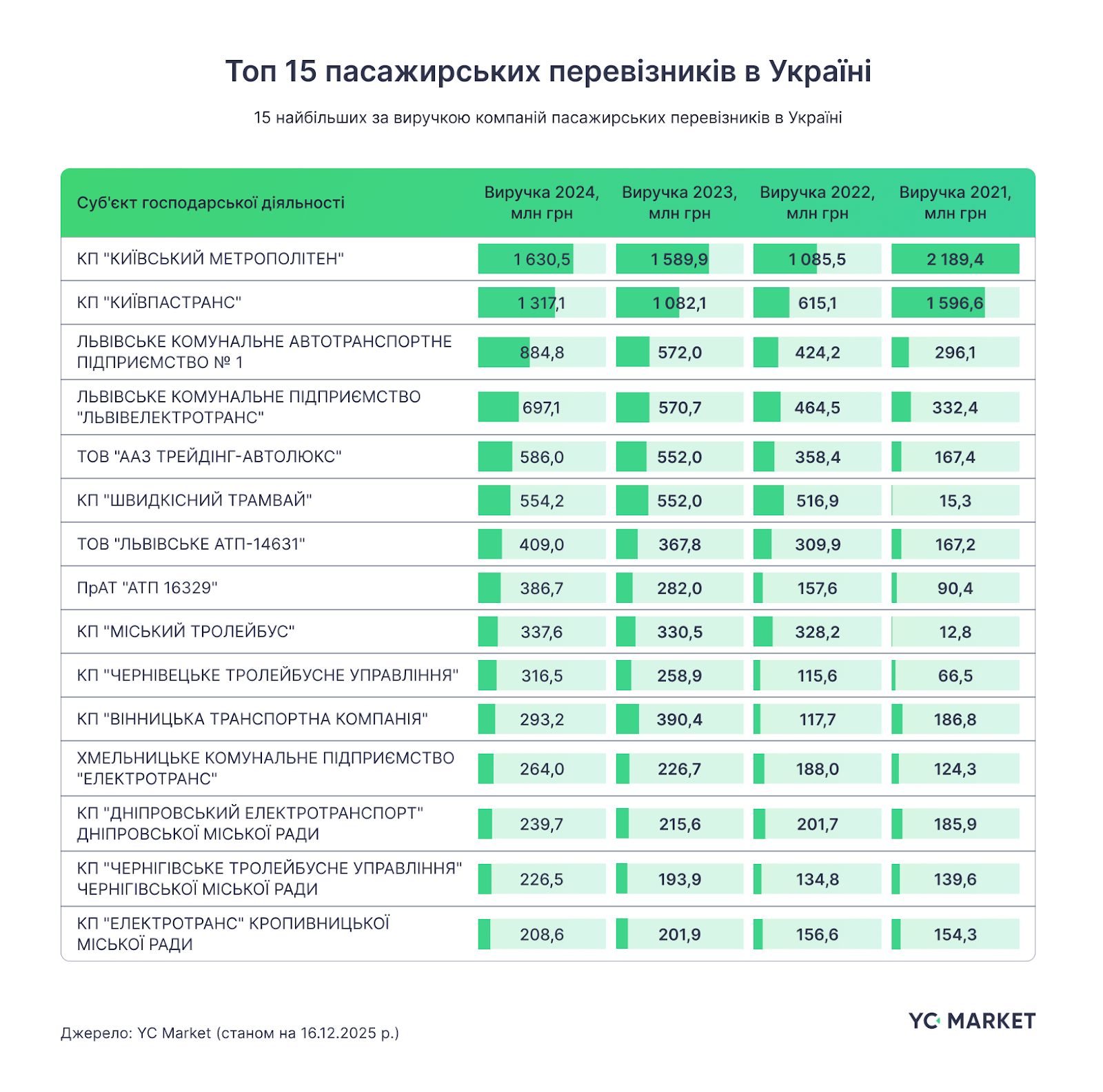 Як свідчать дані системи YC.Market, топ-10 пасажирських перевізників за виручкою демонструє високу концентрацію офіційних доходів у вузькому колі операторів – переважно комунальних або кількох великих приватних міжміських компаній. Київські та львівські муніципальні перевізники стабільно входять до числа лідерів, що логічно зумовлено масштабом цих міських агломерацій, регулярністю перевезень та бюджетною підтримкою, яка частково згладжує воєнні ризики. Водночас навіть найбільші гравці (1–2,5 млрд грн виручки на рік) генерують відносно невеликі доходи у порівнянні з обсягом усього ринку. Для прикладу, сукупна річна виручка топ-15 операторів у 2024 році склала близько 8,3 млрд грн, тобто лише 29% від розрахункового ринку.