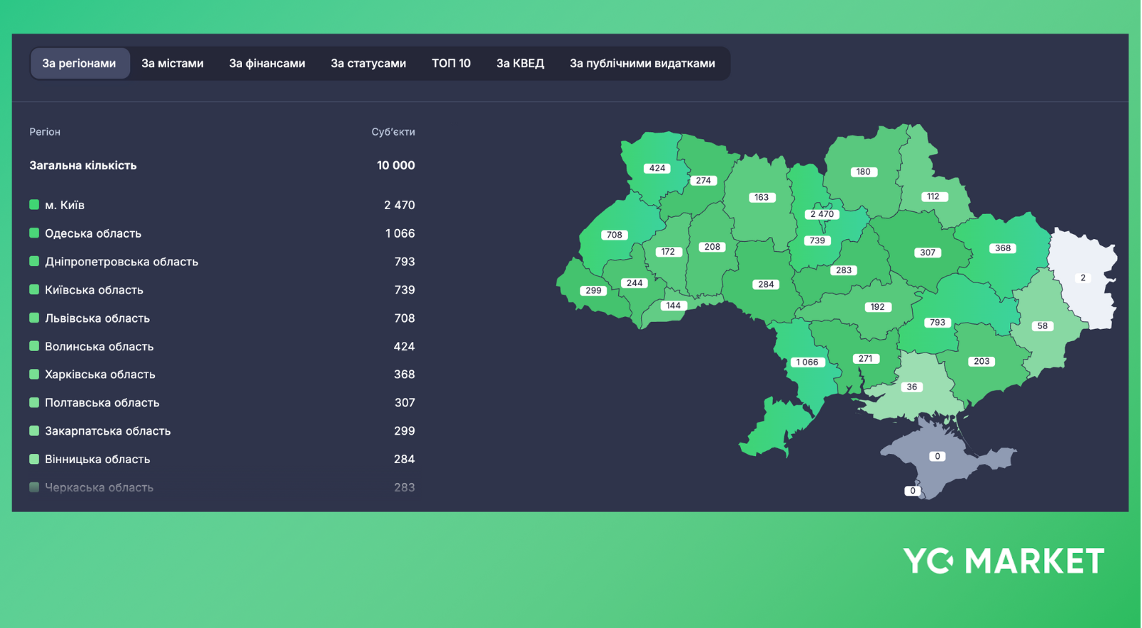 Спершу ви отримаєте аналітику за власними фільтрами. Частки ринку, середні фінансові показники в сфері та концентрація гравців у регіонах.