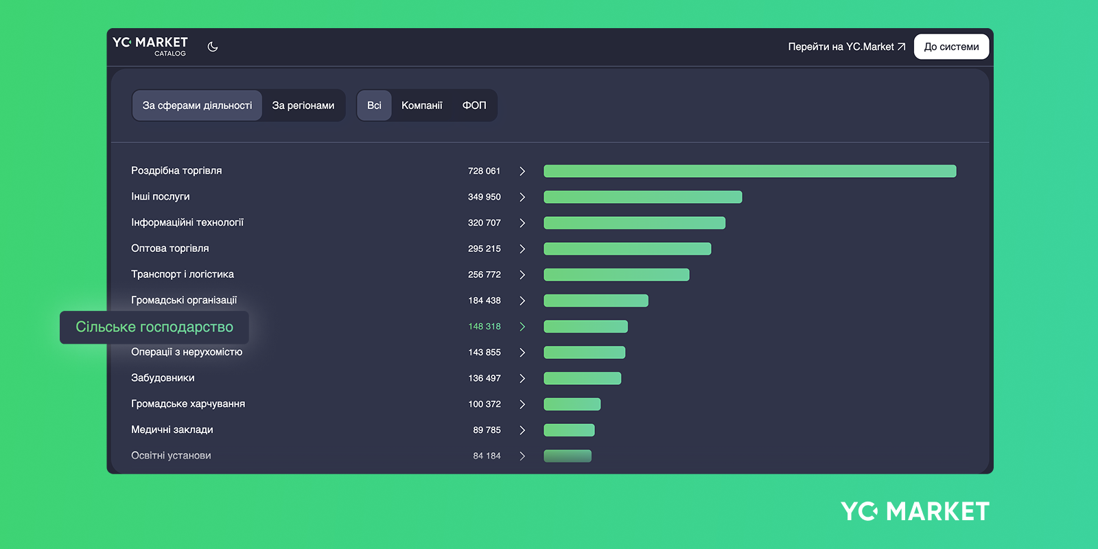 У каталозі YC.Market згруповані всі зареєстровані компанії України за відповідними секторами економіки. Оберіть потрібну галузь і перегляньте безкоштовно лідерів-аграріїв на українському ринку.
