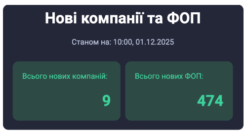Щодня в Україні реєструються десятки нових компаній і ФОП. Станом на момент публікації матеріалу створились — 9 нових компаній і 474 ФОПи.